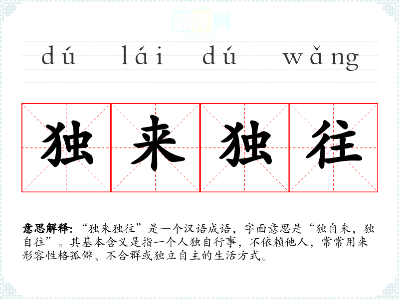 “独来独往”是一个汉语成语,字面意思是“独自来,独自往”。其基本含义是指一个人独自行事,不依赖他人,常常用来形容性格孤僻、不合群或独立自主的生活方式。