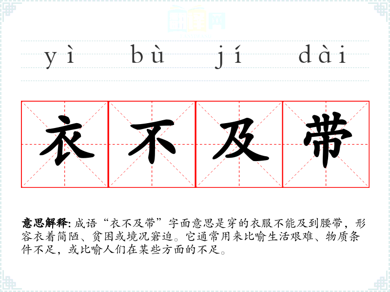 成语“衣不及带”字面意思是穿的衣服不能及到腰带,形容衣着简陋、贫困或境况窘迫。它通常用来比喻生活艰难、物质条件不足,或比喻人们在某些方面的不足。