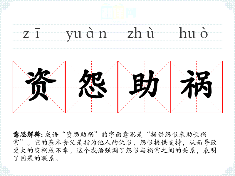 成语“资怨助祸”的字面意思是“提供怨恨来助长祸害”。它的基本含义是指为他人的仇恨、怨恨提供支持,从而导致更大的灾祸或不幸。这个成语强调了怨恨与祸害之间的关系,表明了因果的联系。