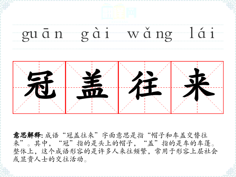 成语“冠盖往来”字面意思是指“帽子和车盖交替往来”。其中,“冠”指的是头上的帽子,“盖”指的是车的车篷。整体上,这个成语形容的是许多人来往频繁,常用于形容上层社会或显贵人士的交往活动。