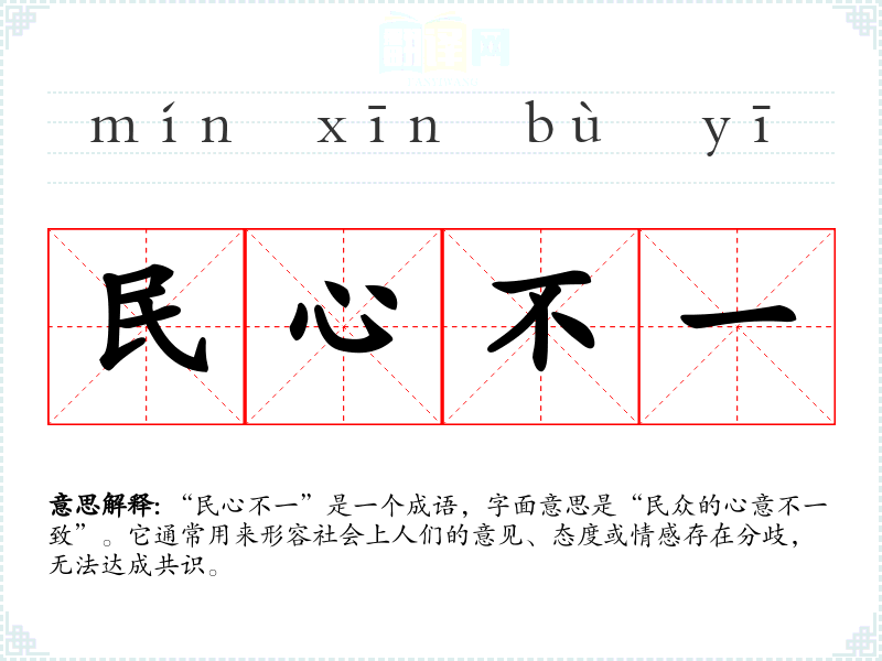 “民心不一”是一个成语,字面意思是“民众的心意不一致”。它通常用来形容社会上人们的意见、态度或情感存在分歧,无法达成共识。
