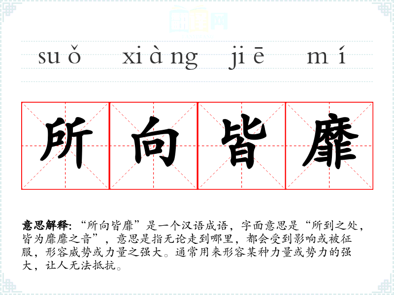 “所向皆靡”是一个汉语成语,字面意思是“所到之处,皆为靡靡之音”,意思是指无论走到哪里,都会受到影响或被征服,形容威势或力量之强大。通常用来形容某种力量或势力的强大,让人无法抵抗。
