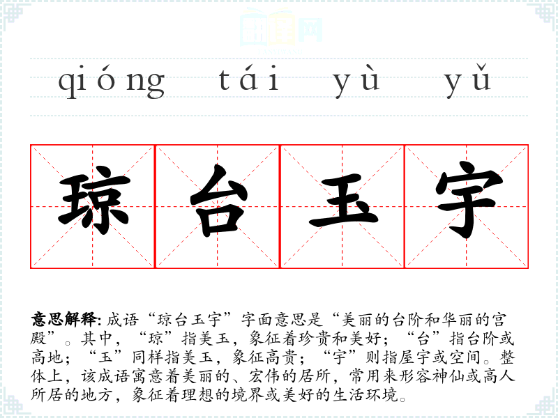 成语“琼台玉宇”字面意思是“美丽的台阶和华丽的宫殿”。其中,“琼”指美玉,象征着珍贵和美好;“台”指台阶或高地;“玉”同样指美玉,象征高贵;“宇”则指屋宇或空间。整体上,该成语寓意着美丽的、宏伟的居所,常用来形容神仙或高人所居的地方,象征着理想的境界或美好的生活环境。