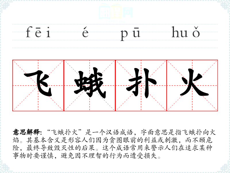 “飞蛾扑火”是一个汉语成语,字面意思是指飞蛾扑向火焰。其基本含义是形容人们因为贪图眼前的利益或刺激,而不顾危险,最终导致毁灭性的后果。这个成语常用来警示人们在追求某种事物时要谨慎,避免因不理智的行为而遭受损失。