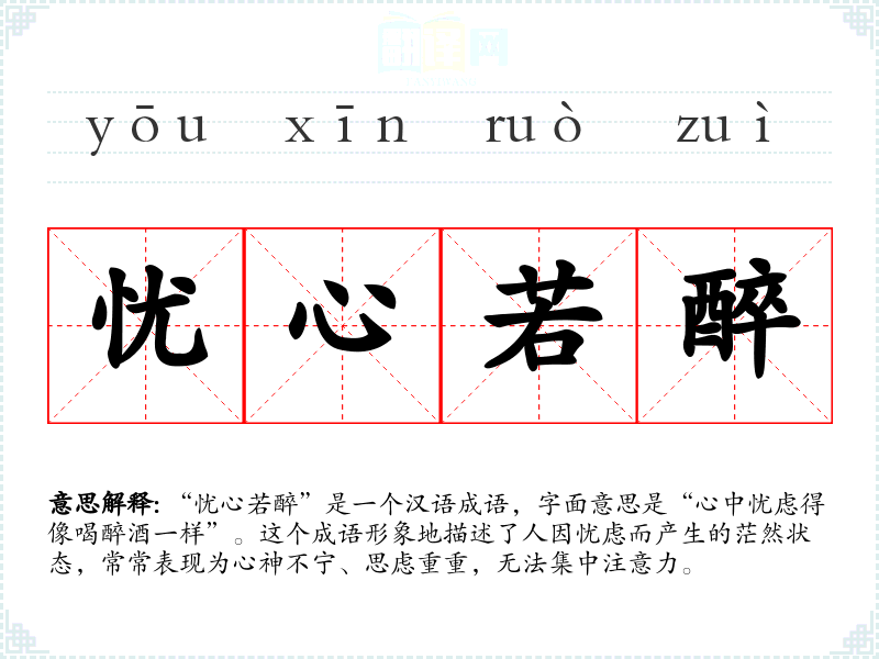 “忧心若醉”是一个汉语成语,字面意思是“心中忧虑得像喝醉酒一样”。这个成语形象地描述了人因忧虑而产生的茫然状态,常常表现为心神不宁、思虑重重,无法集中注意力。