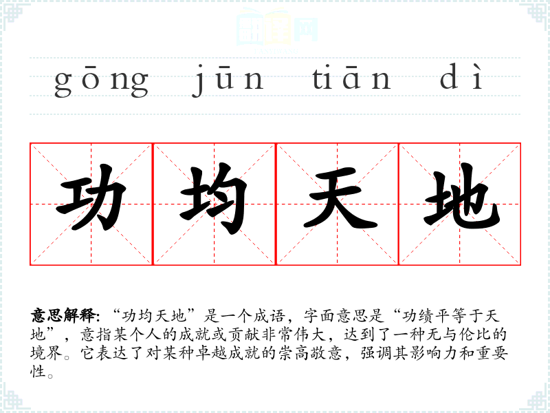 “功均天地”是一个成语,字面意思是“功绩平等于天地”,意指某个人的成就或贡献非常伟大,达到了一种无与伦比的境界。它表达了对某种卓越成就的崇高敬意,强调其影响力和重要性。