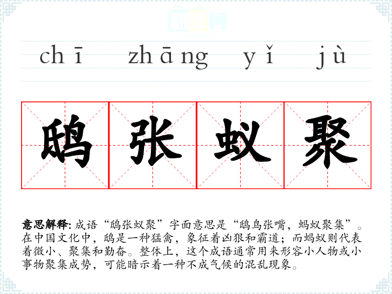 成语“鸱张蚁聚”字面意思是“鸱鸟张嘴,蚂蚁聚集”。在**文化中,鸱是一种猛禽,象征着凶狠和霸道;而蚂蚁则代表着微小、聚集和勤奋。整体上,这个成语通常用来形容小人物或小事物聚集成势,可能暗示着一种不成气候的混乱现象。