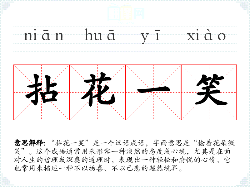 “拈花一笑”是一个汉语成语,字面意思是“捻着花朵微笑”。这个成语通常用来形容一种淡然的态度或心境,尤其是在面对人生的哲理或深奥的道理时,表现出一种轻松和愉悦的心情。它也常用来描述一种不以物喜、不以己悲的超然境界。
