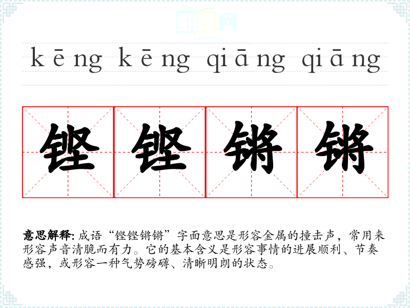 成语“铿铿锵锵”字面意思是形容金属的撞击声,常用来形容声音清脆而有力。它的基本含义是形容事情的进展顺利、节奏感强,或形容一种气势磅礴、清晰明朗的状态。