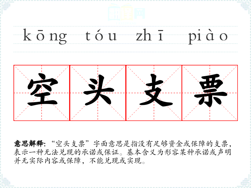 “空头支票”字面意思是指没有足够资金或保障的支票,表示一种无法兑现的承诺或保证。基本含义为形容某种承诺或声明并无实际内容或保障,不能兑现或实现。