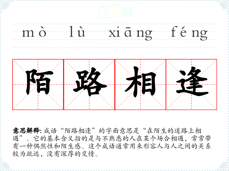 成语“陌路相逢”的字面意思是“在陌生的道路上相遇”。它的基本含义指的是与不熟悉的人在某个场合相遇,常常带有一种偶然性和陌生感。这个成语通常用来形容人与人之间的关系较为疏远,没有深厚的交情。