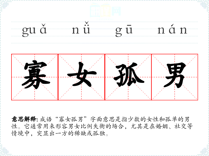 成语“寡女孤男”字面意思是指少数的女性和孤单的男性。它通常用来形容男女比例失衡的场合,尤其是在婚姻、社交等情境中,突显出一方的稀缺或孤独。