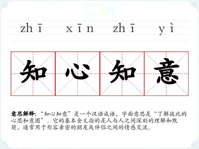 “知心知意”是一个汉语成语,字面意思是“了解彼此的心思和意图”。它的基本含义指的是人与人之间深刻的理解和默契,通常用于形容亲密的朋友或伴侣之间的情感交流。