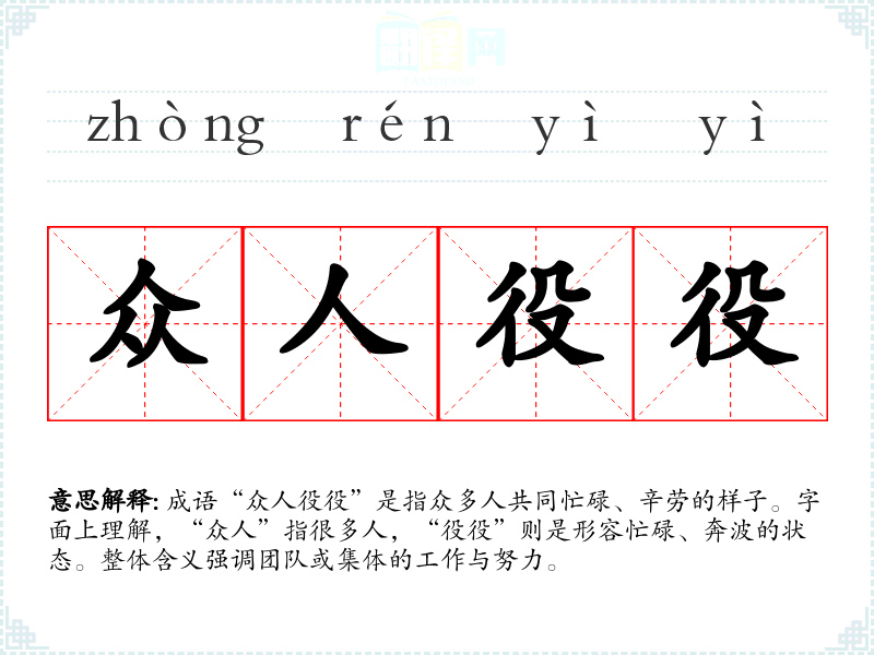 成语“众人役役”是指众多人共同忙碌、辛劳的样子。字面上理解,“众人”指很多人,“役役”则是形容忙碌、奔波的状态。整体含义强调团队或集体的工作与努力。