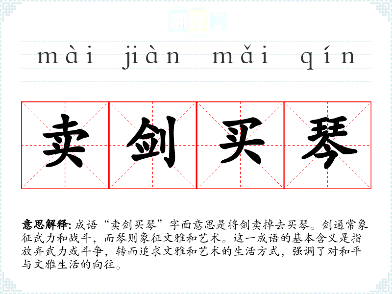 成语“卖剑买琴”字面意思是将剑卖掉去买琴。剑通常象征武力和战斗,而琴则象征文雅和艺术。这一成语的基本含义是指放弃武力或斗争,转而追求文雅和艺术的生活方式,强调了对和平与文雅生活的向往。