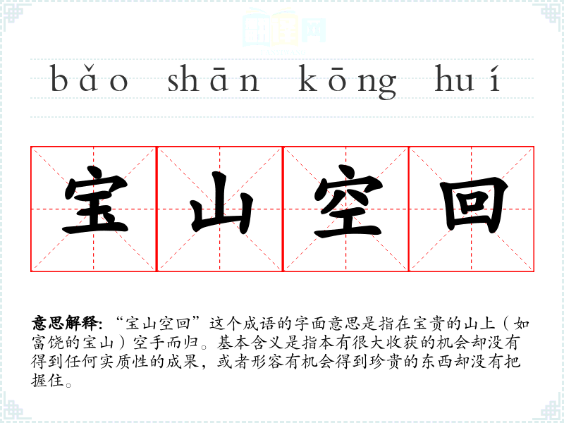“宝山空回”这个成语的字面意思是指在宝贵的山上(如富饶的宝山)空手而归。基本含义是指本有很大收获的机会却没有得到任何实质性的成果,或者形容有机会得到珍贵的东西却没有把握住。