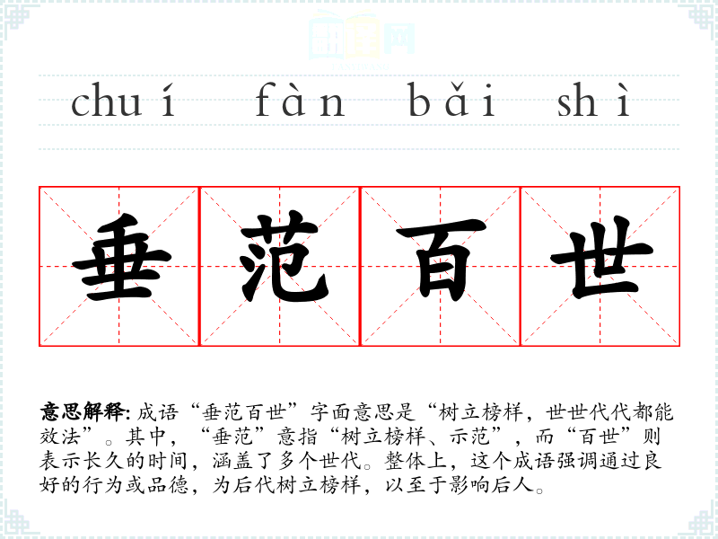 成语“垂范百世”字面意思是“树立榜样,世世代代都能效法”。其中,“垂范”意指“树立榜样、示范”,而“百世”则表示长久的时间,涵盖了多个世代。整体上,这个成语强调通过良好的行为或品德,为后代树立榜样,以至于影响后人。