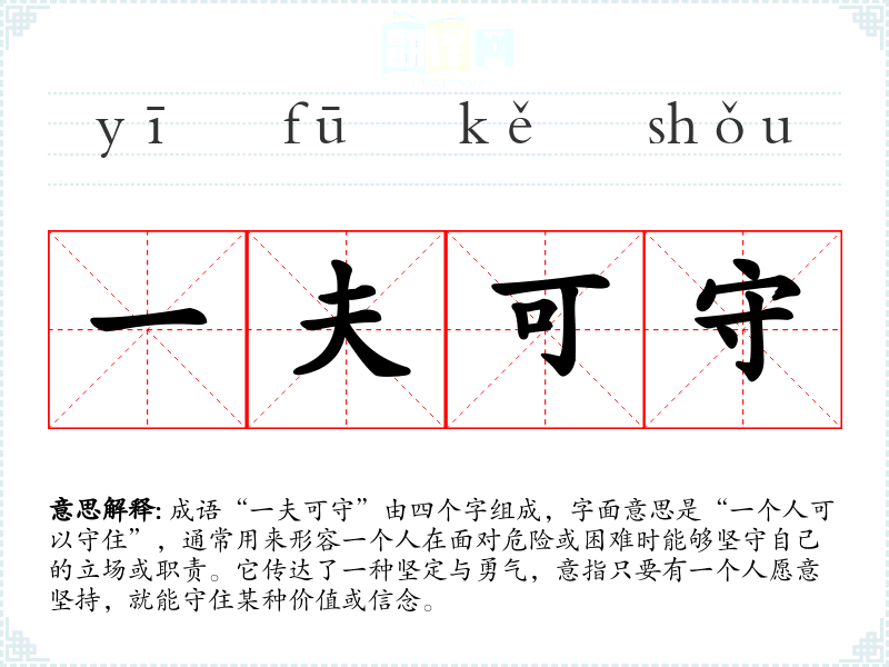 成语“一夫可守”由四个字组成,字面意思是“一个人可以守住”,通常用来形容一个人在面对危险或困难时能够坚守自己的立场或职责。它传达了一种坚定与勇气,意指只要有一个人愿意坚持,就能守住某种价值或信念。