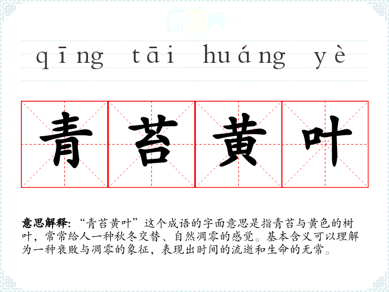 “青苔黄叶”这个成语的字面意思是指青苔与黄色的树叶,常常给人一种秋冬交替、自然凋零的感觉。基本含义可以理解为一种衰败与凋零的象征,表现出时间的流逝和生命的无常。