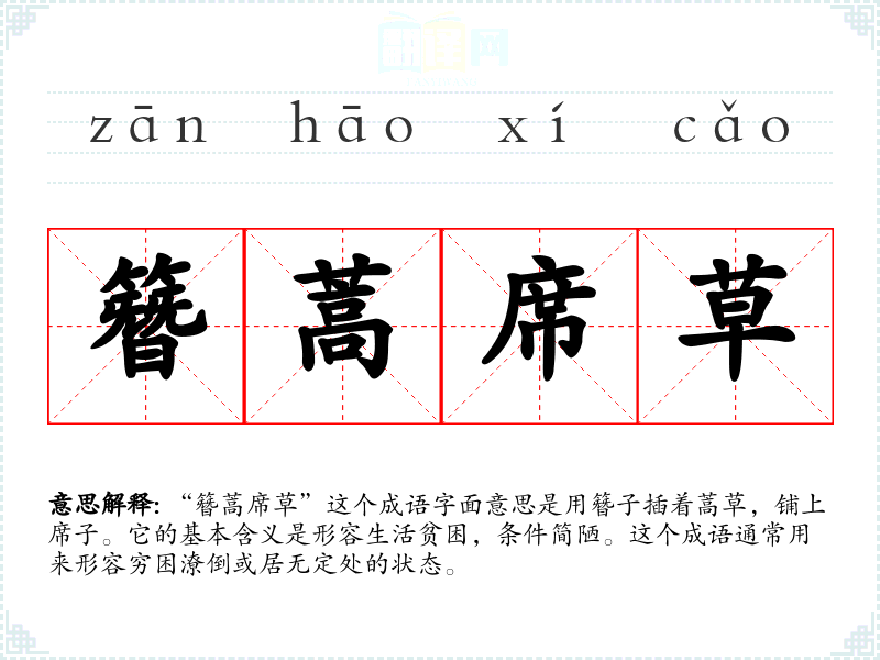 “簪蒿席草”这个成语字面意思是用簪子插着蒿草,铺上席子。它的基本含义是形容生活贫困,条件简陋。这个成语通常用来形容穷困潦倒或居无定处的状态。