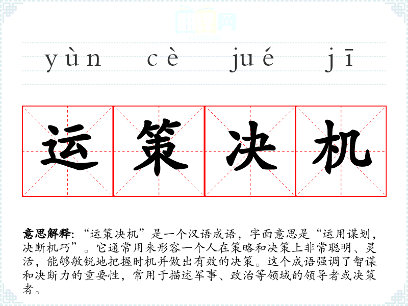 “运策决机”是一个汉语成语,字面意思是“运用谋划,决断机巧”。它通常用来形容一个人在策略和决策上非常聪明、灵活,能够敏锐地把握时机并做出有效的决策。这个成语强调了智谋和决断力的重要性,常用于描述军事、政治等领域的领导者或决策者。