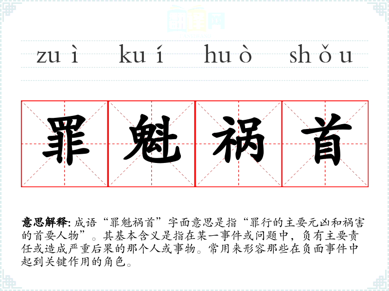 成语“罪魁祸首”字面意思是指“罪行的主要元凶和祸害的首要人物”。其基本含义是指在某一或问题中,负有主要责任或造成严重后果的那个人或事物。常用来形容那些在负面中起到关键作用的角色。