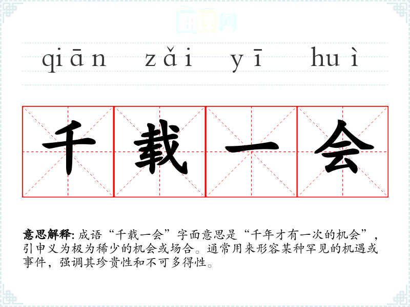 “千载一会”出自《后汉书·王允传》,原文是“千载一遇”,意指千年才会遇到一次。这个成语反映了古人对时间与机会的深刻认识,强调了历史长河中偶然性与偶遇的珍贵。