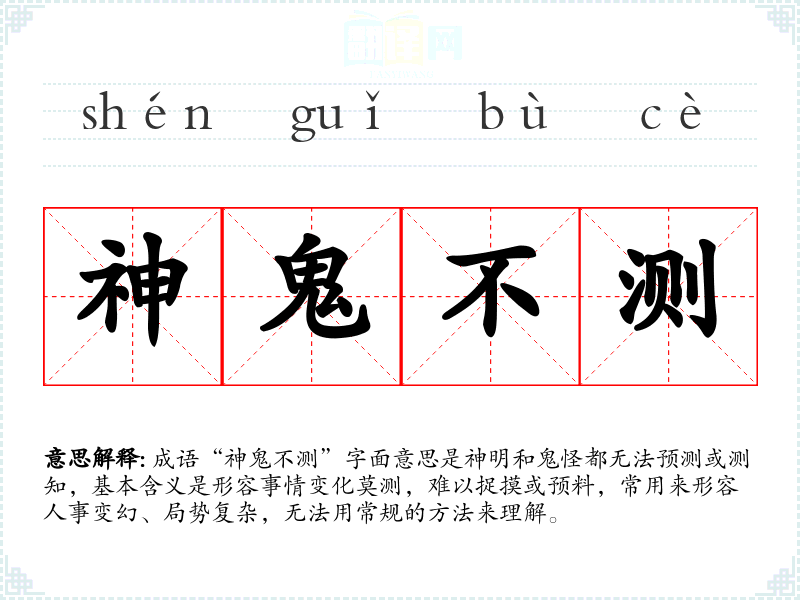 在英语中,类似的表达是“beyond comprehension”(超出理解),也传达了事情的复杂性和不可预测性。然而,中文的“神鬼不测”则更具文化色彩,强调了神秘力量的影响。