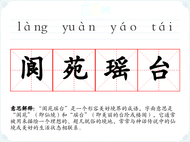 “阆苑瑶台”是一个形容美好境界的成语,字面意思是“阆苑”(即仙境)和“瑶台”(即美丽的台阶或楼阁),它通常被用来描绘一个理想的、超凡脱俗的境地,常常与神话传说中的仙境或美好的生活状态相联系。
