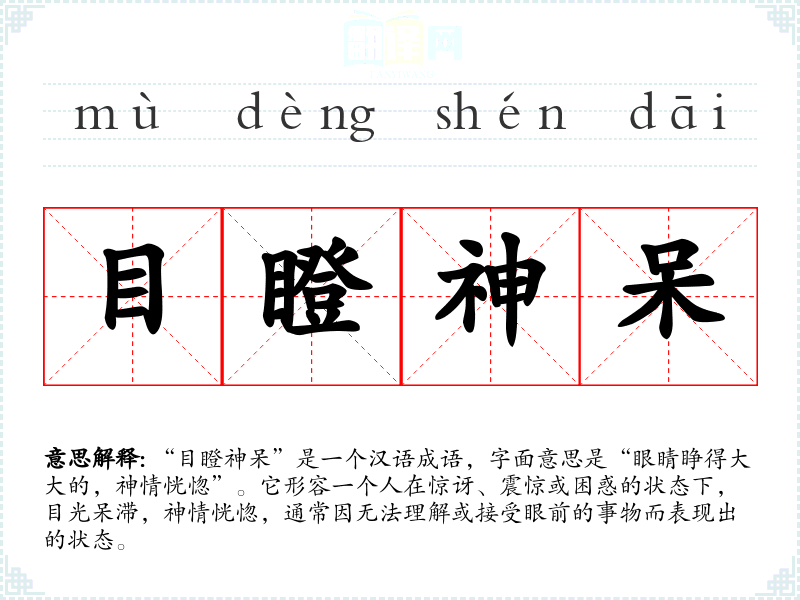 “目瞪神呆”是一个汉语成语,字面意思是“眼睛睁得大大的,神情恍惚”。它形容一个人在惊讶、震惊或困惑的状态下,目光呆滞,神情恍惚,通常因无法理解或接受眼前的事物而表现出的状态。