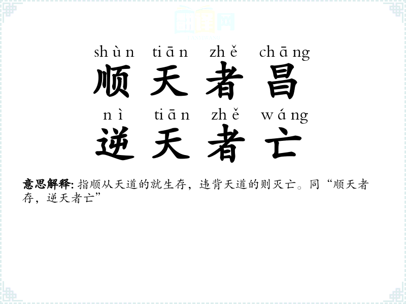 顺:顺从;昌:昌盛;逆:违背;亡:灭亡。顺应民众的就能兴旺,违逆民众的定要衰亡。 |