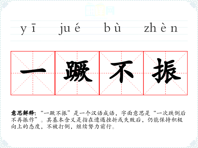 “一蹶不振”是一个汉语成语,字面意思是“一次跌倒后不再振作”。其基本含义是指在遭遇挫折或失败后,仍能保持积极向上的态度,不被打倒,继续努力前行。