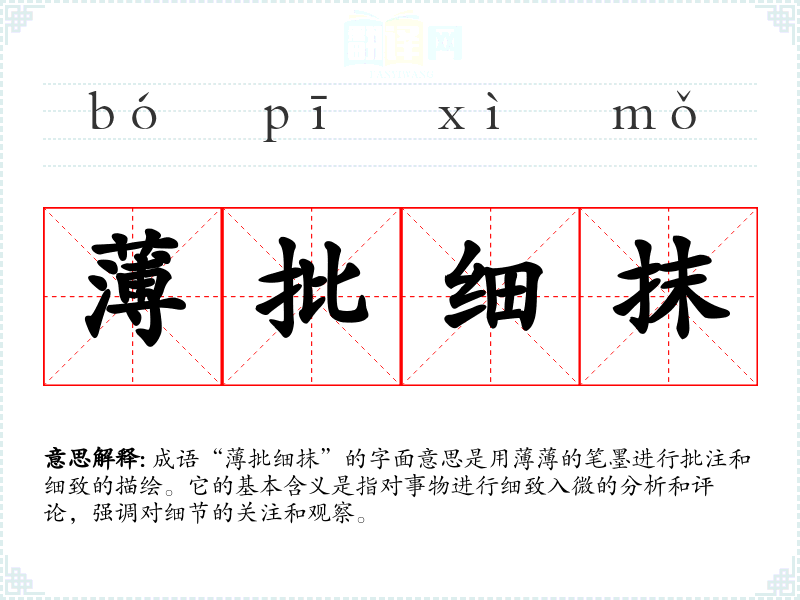 “批细抹”并不是一个广为人知的成语,可能源于古代文人对于书法和绘画技法的描述。字面上,“批”指的是轻*的画笔或书写,而“细抹”则是指细致的涂抹,这在古代文人创作中常常被提及。
