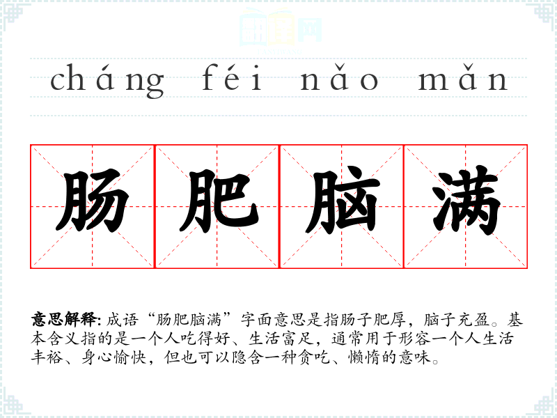 成语“肠肥脑满”字面意思是指肠子肥厚,脑子充盈。基本含义指的是一个人吃得好、生活富足,通常用于形容一个人生活丰裕、身心愉快,但也可以隐含一种贪吃、懒惰的意味。