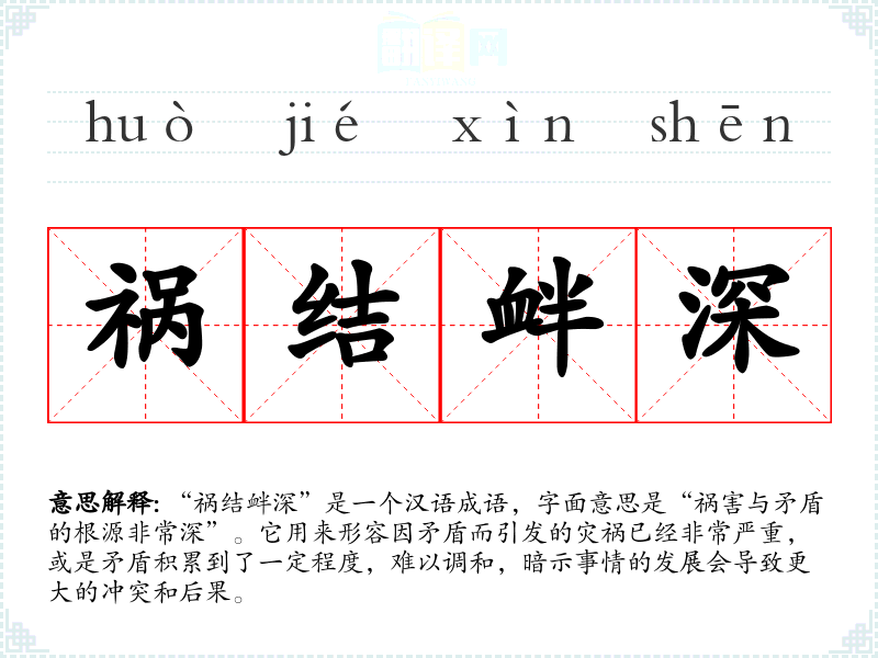 | 祸结衅深 | 灾祸接连不断,矛盾巨大深重。 |