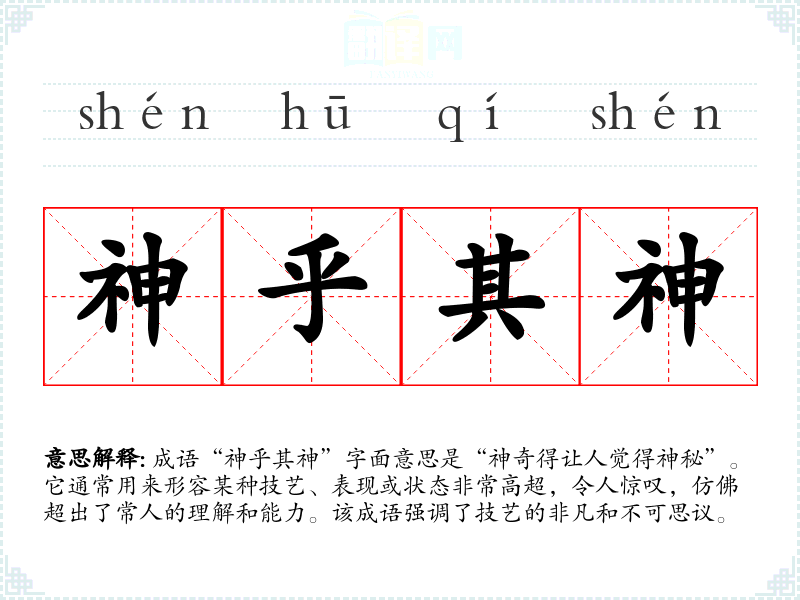 成语“神乎其神”字面意思是“神奇得让人觉得神秘”。它通常用来形容某种技艺、表现或状态非常高超,令人惊叹,仿佛超出了常人的理解和能力。该成语强调了技艺的非凡和不可思议。