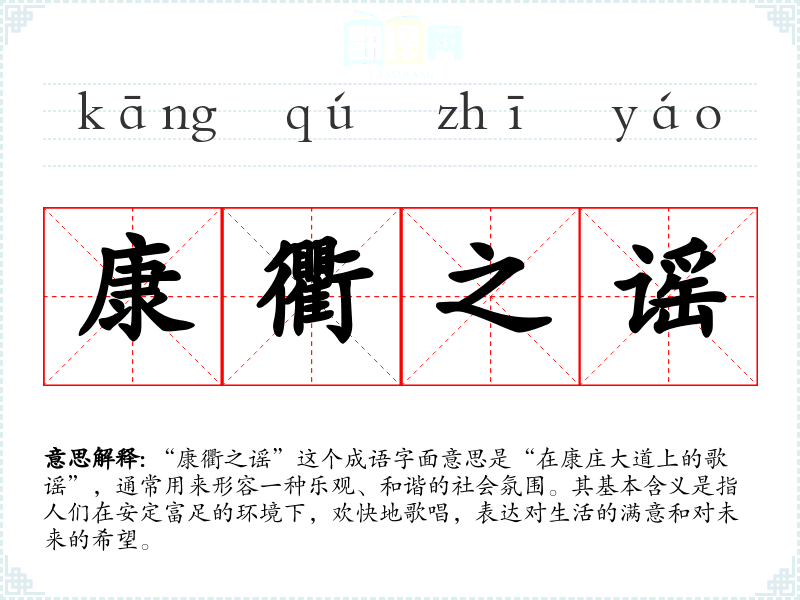 “康衢之谣”这个成语字面意思是“在康庄大道上的歌谣”,通常用来形容一种乐观、和谐的社会氛围。其基本含义是指人们在安定富足的环境下,欢快地歌唱,表达对生活的满意和对未来的希望。