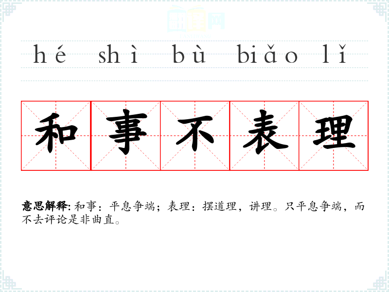 | 和事不表理 | 和事:平息争端;表理:摆道理,讲理。只平息争端,而不去评论是非曲直。 |