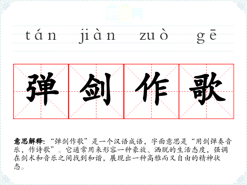 在**传统文化中,文人与武人的结合常常被视为理想人格的体现。“弹剑作歌”不仅反映了文人对诗歌和音乐的热爱,也象征着一种追求精神自由的生活态度。在现代社会,该成语可以用来鼓励人们在生活中找到乐趣,追求个人的兴趣和爱好。