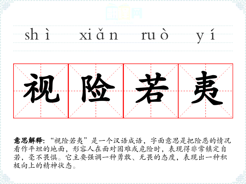 “视险若夷”是一个汉语成语,字面意思是把险恶的情况看作平坦的地面,形容人在面对困难或危险时,表现得非常镇定自若,毫不畏惧。它主要强调一种勇敢、无畏的态度,表现出一种积极向上的精神状态。