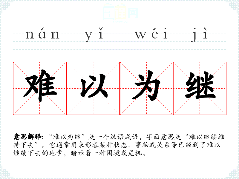 “难以为继”是一个汉语成语,字面意思是“难以继续维持下去”。它通常用来形容某种状态、事物或关系等已经到了难以继续下去的地步,暗示着一种困境或危机。