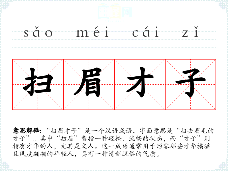 “扫眉才子”是一个汉语成语,字面意思是“扫去眉毛的才子”。其中“扫眉”意指一种轻松、流畅的状态,而“才子”则指有才华的人,尤其是文人。这一成语通常用于形容那些才华横溢且风度翩翩的年轻人,具有一种清新脱俗的气质。