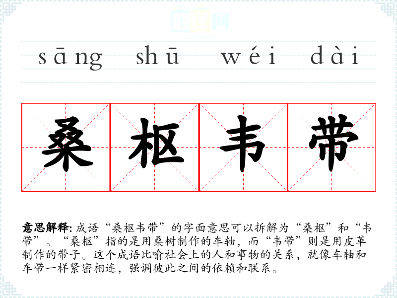 成语“桑枢韦带”的字面意思可以拆解为“桑枢”和“韦带”。“桑枢”指的是用桑树制作的车轴,而“韦带”则是用皮革制作的带子。这个成语比喻社会上的人和事物的关系,就像车轴和车带一样紧密相连,强调彼此之间的依赖和联系。