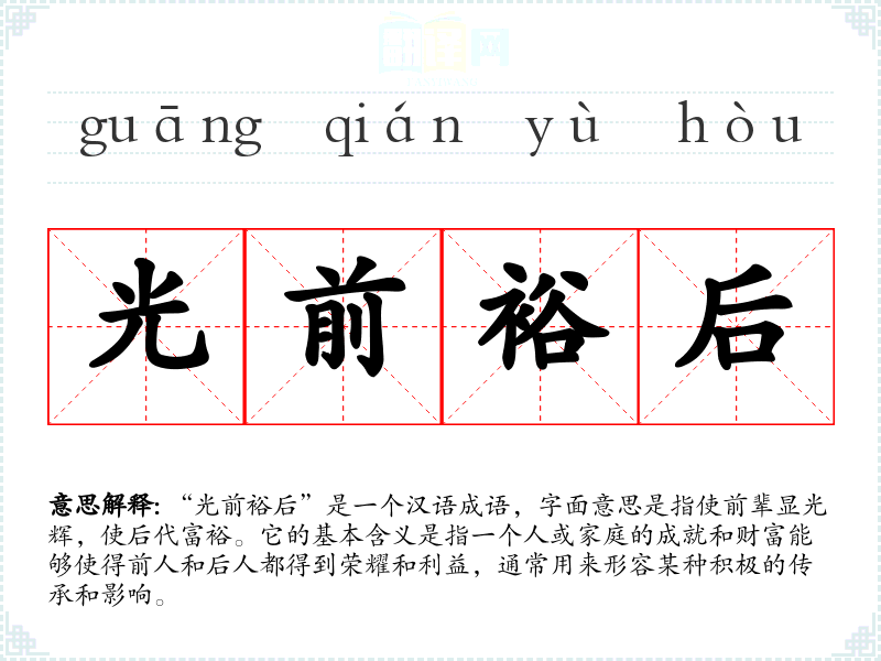 “光前裕后”是一个汉语成语,字面意思是指使前辈显光辉,使后代富裕。它的基本含义是指一个人或家庭的成就和财富能够使得前人和后人都得到荣耀和利益,通常用来形容某种积极的传承和影响。