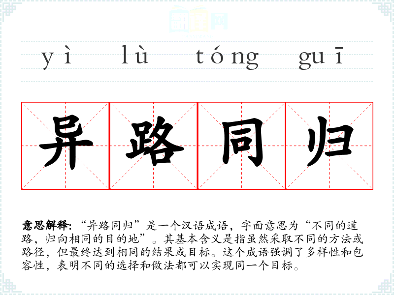 “异路同归”是一个汉语成语,字面意思为“不同的道路,归向相同的目的地”。其基本含义是指虽然采取不同的方法或路径,但最终达到相同的结果或目标。这个成语强调了多样性和包容性,表明不同的选择和做法都可以实现同一个目标。
