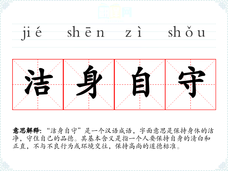 “洁身自守”是一个汉语成语,字面意思是保持身体的洁净,守住自己的品德。其基本含义是指一个人要保持自身的清白和正直,不与不良行为或环境交往,保持高尚的道德标准。
