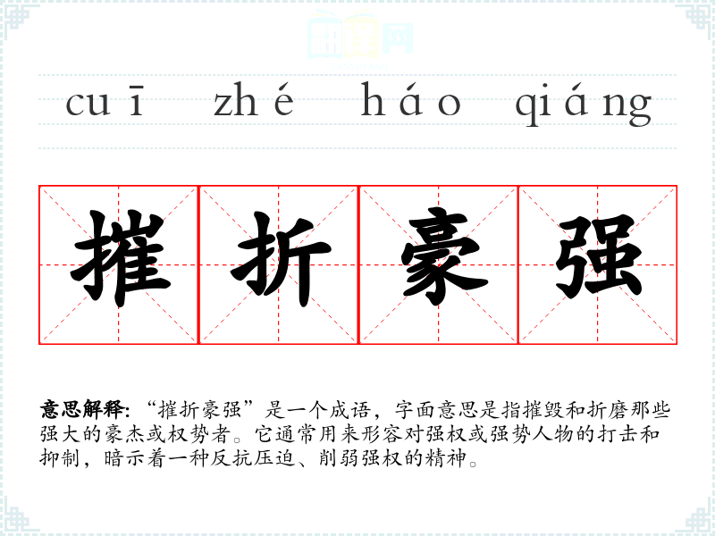 该成语的来源并不十分明确,但可以推测其形成与历史上对豪强势力的批判和抵抗有关。在**历史上,豪强通常指那些拥有高权重和财富的人,他们往往对普通民众施加压迫。“摧折”一词则常常用来形容对敌人或强者的打击,因此该成语可能源于古代文人对豪强的不满和对正义的追求。