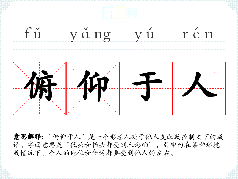 “俯仰于人”是一个形容人处于他人支配或控制之下的成语。字面意思是“低头和抬头都受别人影响”,引申为在某种环境或情况下,个人的地位和命运都要受到他人的左右。