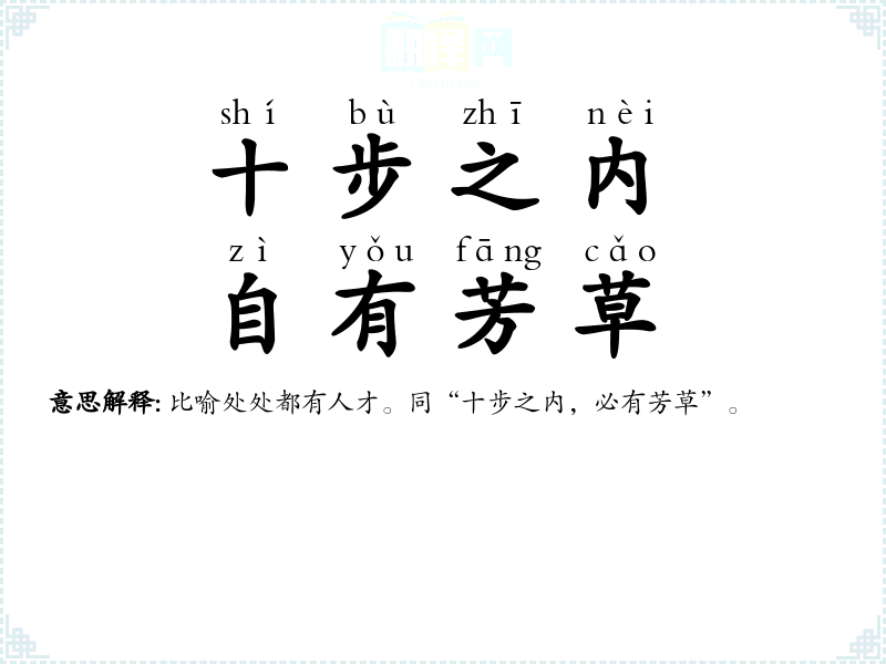 芳草:比喻人才。十步之内,就有芳香的花草。比喻处处都有人才。 |