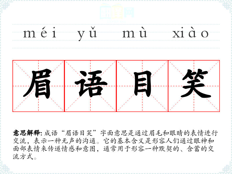 成语“眉语目笑”字面意思是通过眉毛和眼睛的表情进行交流,表示一种无声的沟通。它的基本含义是形容人们通过眼神和面部表情来传递情感和意图,通常用于形容一种默契的、含蓄的交流方式。